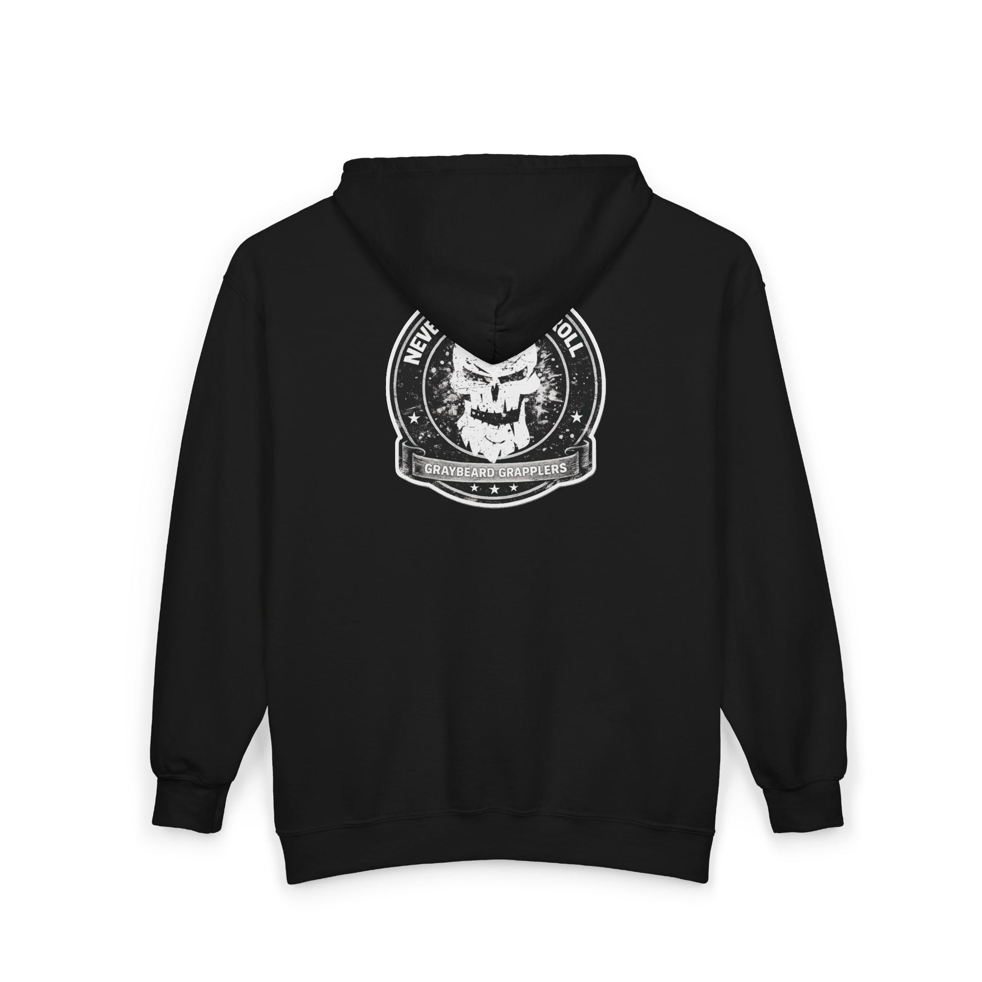 This black full-zip hoodie carries a quiet, rough-hewn energy — a worn-in emblem on the chest and a larger weathered skull crest on the back that reads “Never Too Old To Roll.” It feels like the jacket you reach for before a late-night ride, a dicey gig, or a backyard bonfire. The medium-heavy 50/50 knit gives structure without stiffness; the zip and roomy pockets keep things practical. Small embroidered detail at the left chest adds tactile depth while the larger distressed print on the back tells the story: lived-in, unapologetic, and built to move with you. Slip it on when you want warmth that doesn’t announce itself, but lets the artwork do the talking.